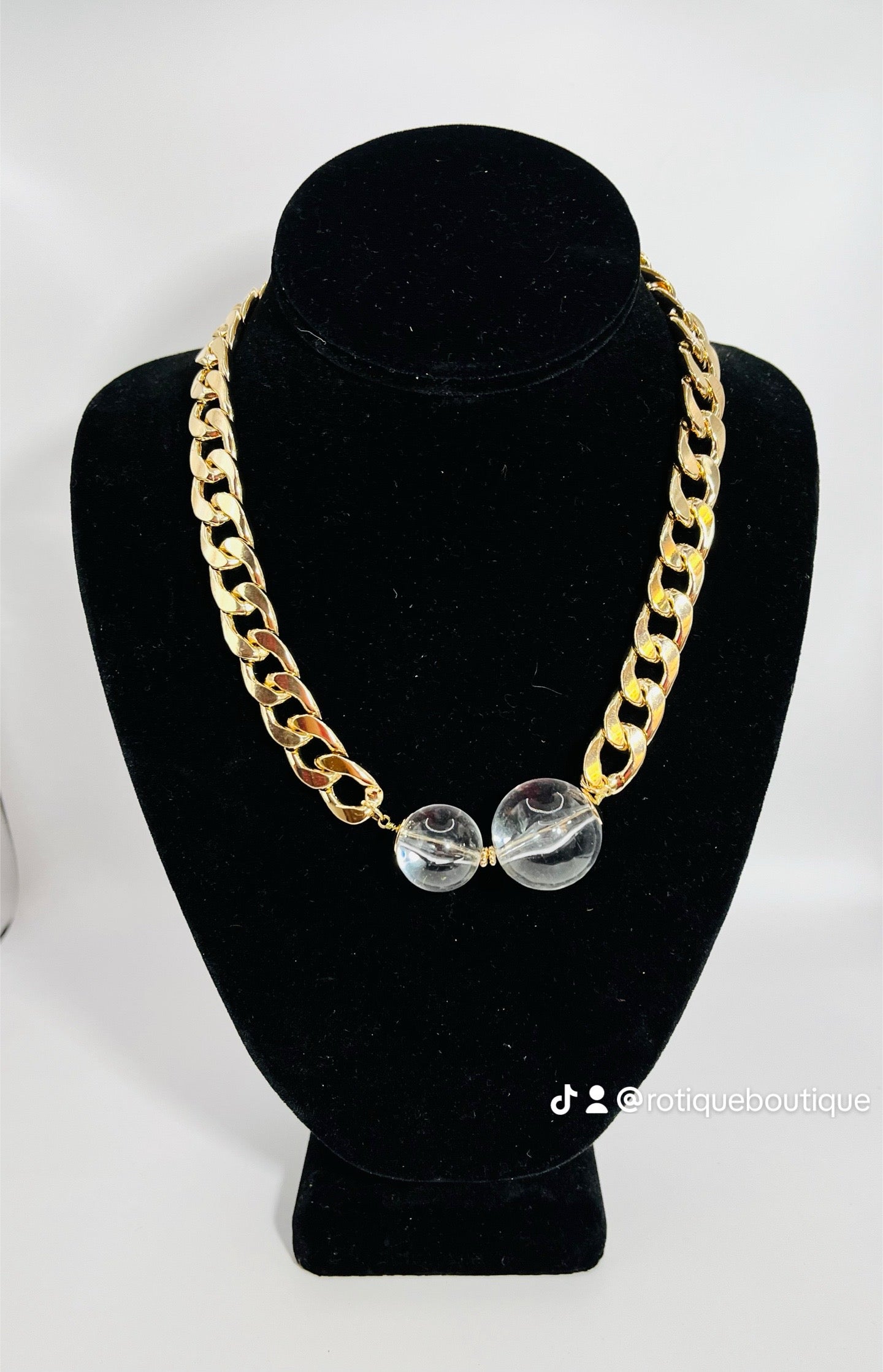 Indulge in luxury with our Chunky Gold Necklace featuring Clear Balls. The bold design exudes sophistication and exclusivity, adding an elegant touch to any outfit. The clear balls add a touch of glamour, allowing you to shine and stand out from the crowd. Elevate your style with this premium statement piece.