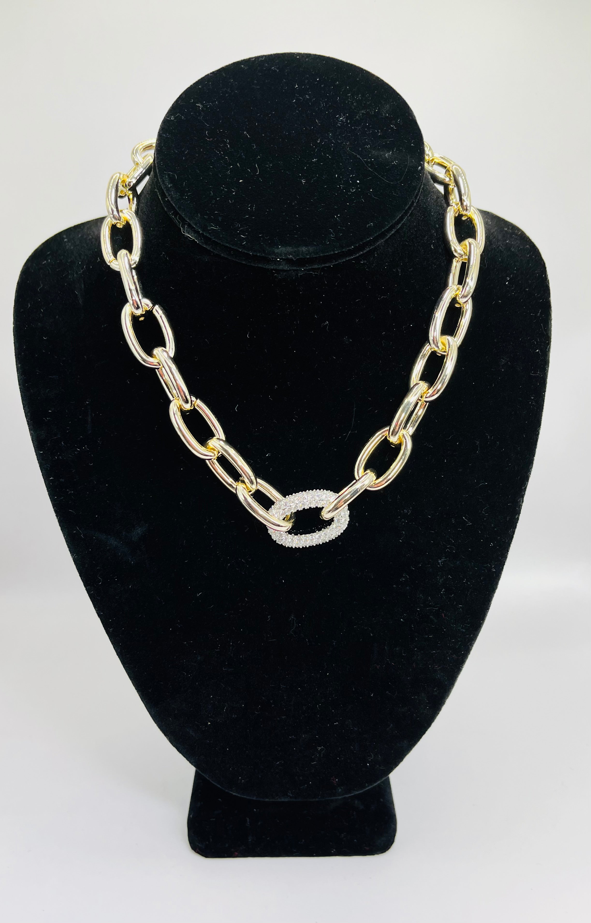 Unleash your inner adventurer with this Gold Link Rhinestone Necklace. The bold design and sparkling rhinestones add a touch of risk to any outfit. Take your style to the next level with this daring accessory. Get ready to shine and stand out from the crowd!