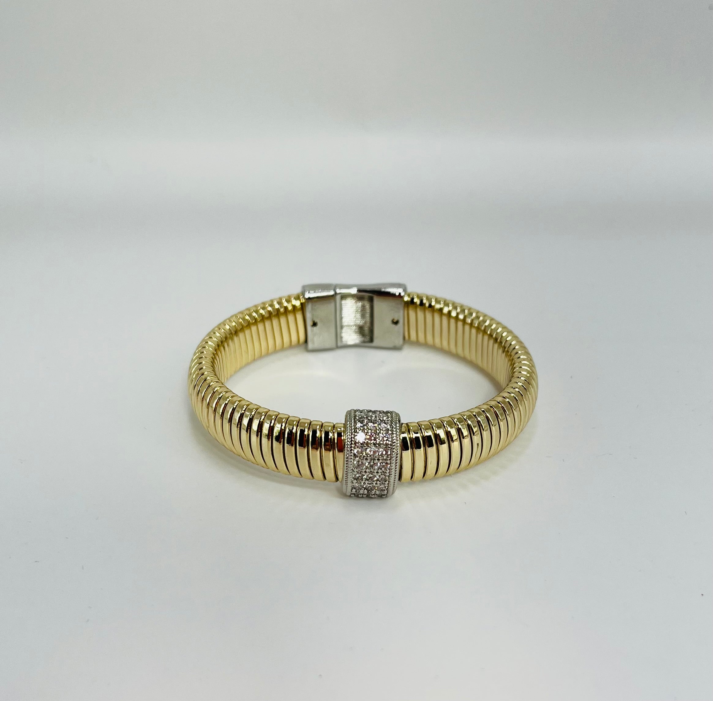 Embrace your daring side with our Rhinstone Gold Hinge Bracelet! Add sparkle to any outfit with this bold piece, featuring stunning rhinestones and a unique hinge design. Make a statement and stand out from the crowd with this adventurous accessory.